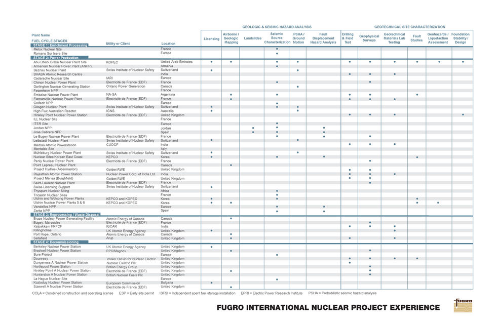 Purpose: summarizes core capabilities by combining interchangeable specialty flyers and standalone project descriptions. Also included are job tables with specific services performed at each site. US and international maps also show job locations. All sheets have a common color theme, font, and cohesive layout.